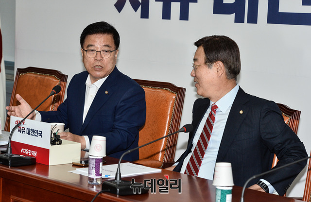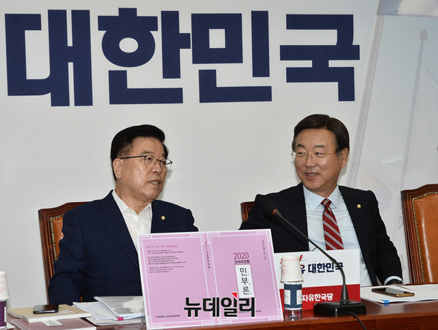 자유한국당 경제대전환위원장인 김광림 최고위원과 김종석 의원이 23일 오전 국회에서 열린 자유한국당 경제비전, 민부론 언론인 간담회에서 대화를 나누고 있다.
