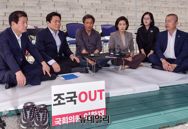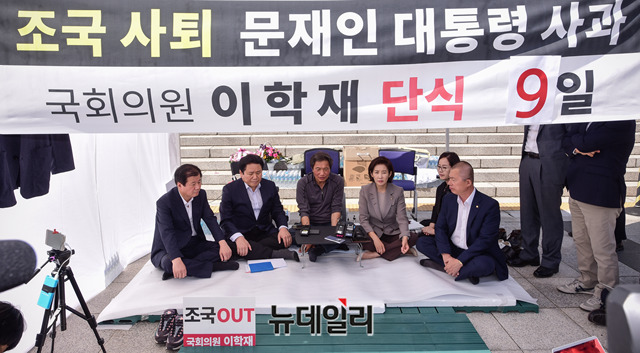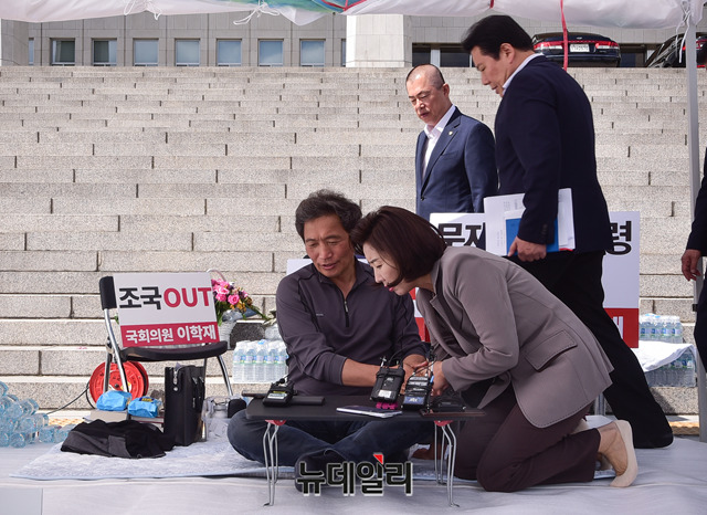 나경원 자유한국당 원내대표, 정양석 원내수석부대표 및 의원들이 23일 오후 국회 본청 계단 앞에서 조국 법무부 장관의 임명 철회를 요구하며 단식 중인 이학재 의원을 찾아 격려하고 있다.