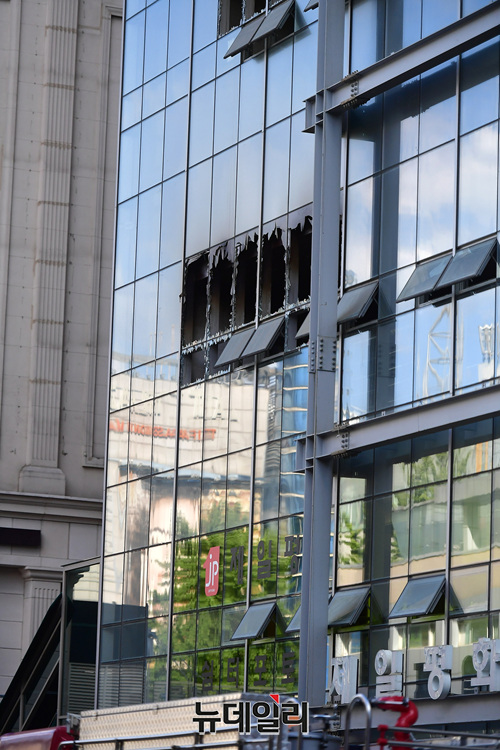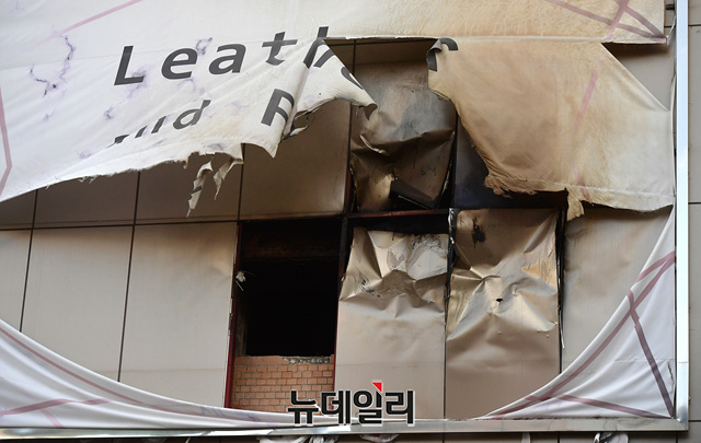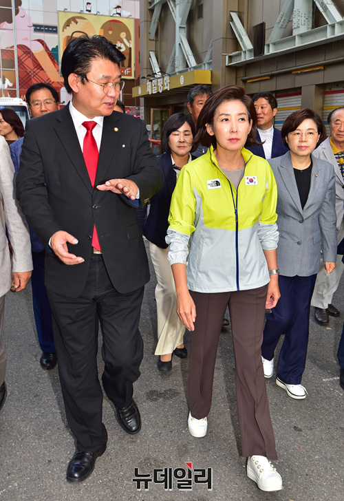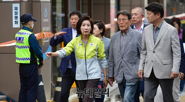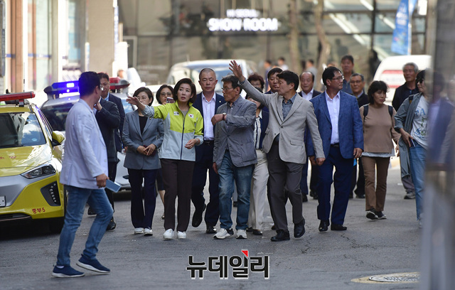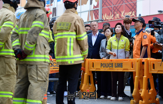 나경원 자유한국당 원내대표가 23일 오후 지난 22일 화재가 난 서울 중구 동대문 제일평화시장 화재 현장을 둘러보고 있다. 이날 현장에는 정용기 정책위의장, 김정재 대변인, 최창식 전 중구청장이 함께했다.