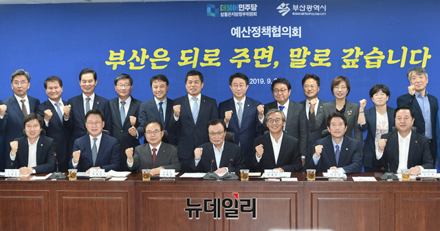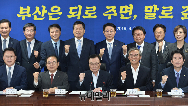 이해찬 더불어민주당 대표, 이인영 원내대표, 오거돈 부산광역시장 및 참석자들이 24일 오후 국회 의원회관에서 열린 부산광역시 예산정책협의회에서 기념촬영을 하고 있다.