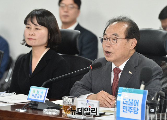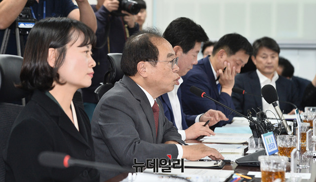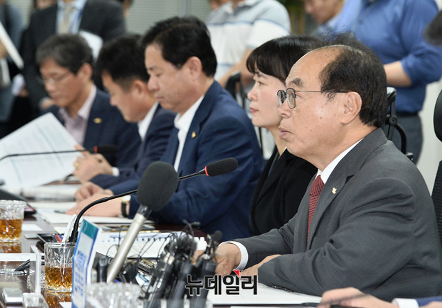 오거돈 부산광역시장이 24일 오후 국회 의원회관에서 열린 부산광역시 예산정책협의회에서 발언을 하고 있다. 이날 오 시장은 '동남권 신공항 사업을 지원해줄 것'을 당부했다.