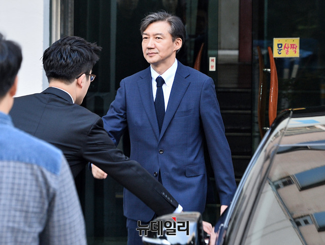 조국 법무부 장관 부인 정경심 교수의 검찰 소환이 임박한 가운데 조 장관이 25일 오전 서울 서초구 자택을 나서고 있다.