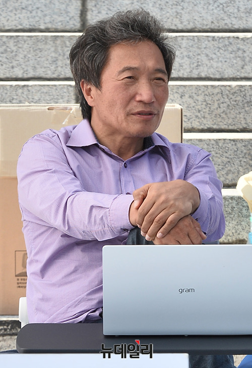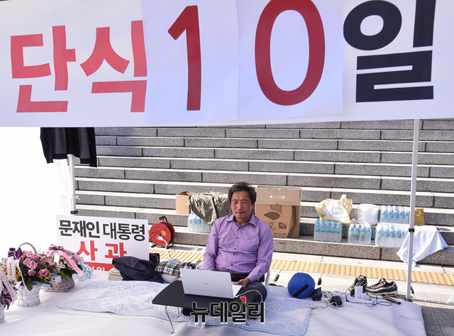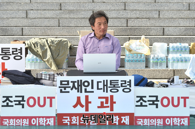 이학재 자유한국당 의원이 지난 24일 오후 국회 본청 앞 계단에서 조국 법무부장관 사퇴를 요구하며 단식투쟁을 하고 있다. 이 의원은 지난 15일부터 단식을 시작했다.