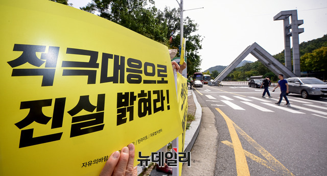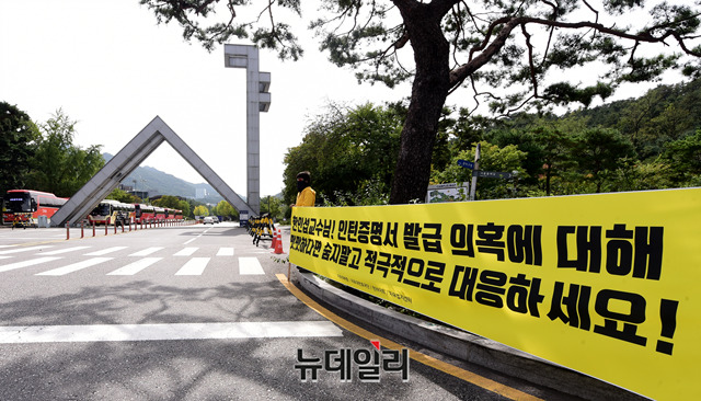 자유대한호국당, 턴라이트 등 우파 시민단체가 25일 오후 서울 관악구 서울대학교 정문에서 '한인섭 교수 파면 촉구 집회'를 가졌다.