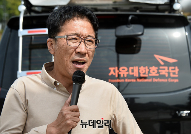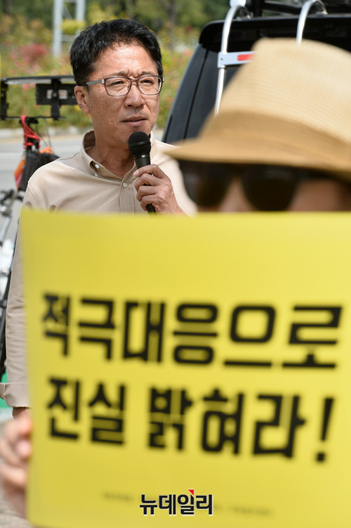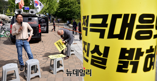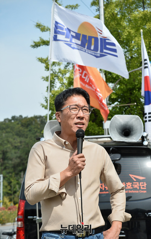 강민구 턴라이트 대표가 25일 오후 서울 관악구 서울대학교 정문에서 열린 '한인섭 교수 파면 촉구 집회'에서 한 교수의 파면을 촉구하고 있다.