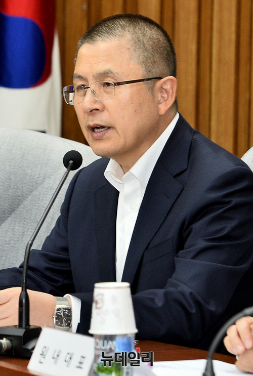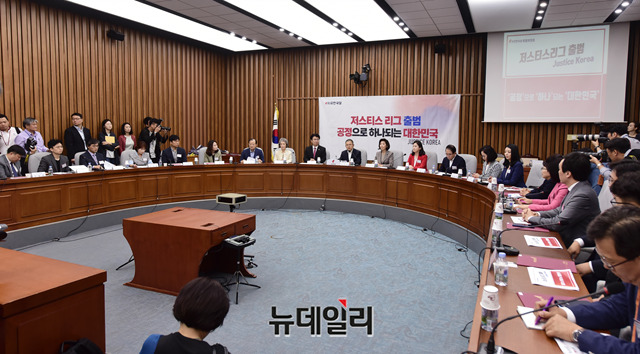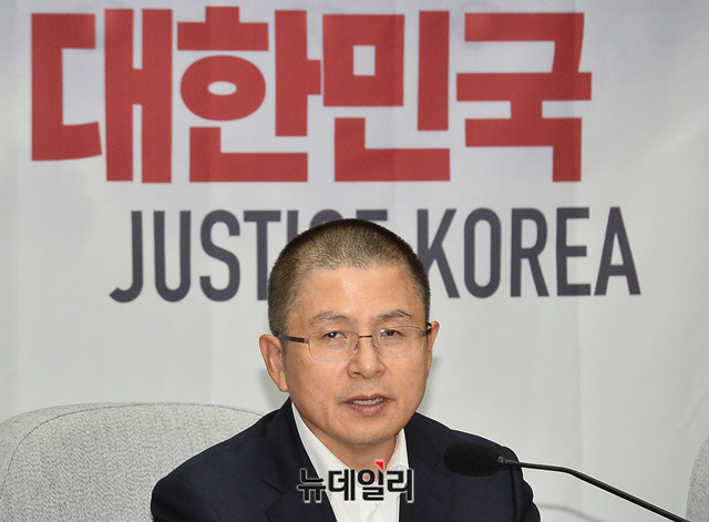 황교안 자유한국당 대표가 26일 오전 국회에서 열린 '자유한국당 저스티스리그 출범식 및 1차 회의'에서 발언을 하고 있다. '저스티스리그'는 자유한국당이 공정 사회 구현을 목표로 만든 기구다.