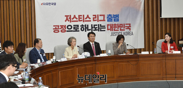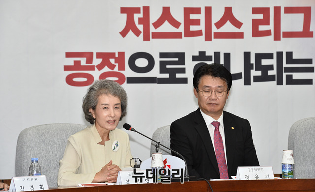 박선영 한국당 저스티스리그 공동위원장이 26일 오전 국회에서 열린 '자유한국당 저스티스리그 출범식 및 1차회의'에서 인사말을 하고 있다. '저스티스리그'는 자유한국당이 공정 사회 구현을 목표로 만든 기구다.