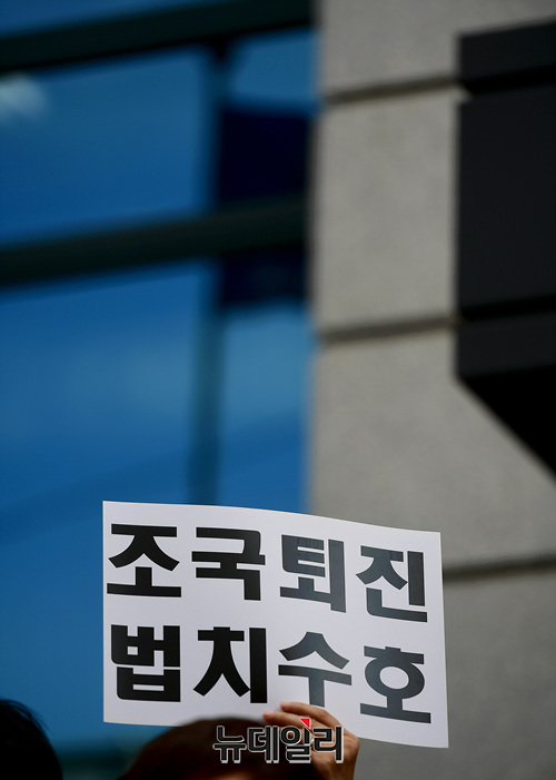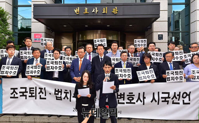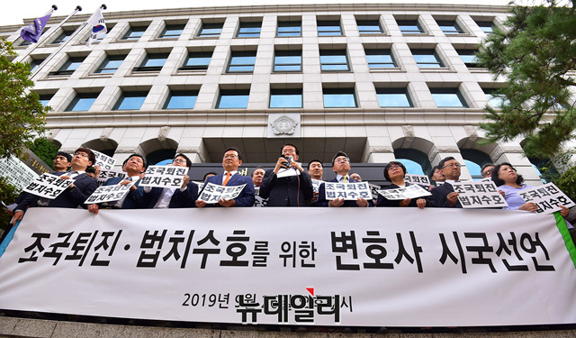 조국 법무부 장관의 사퇴를 요구하는 변호사들이 26일 오후 서울 서초구 서울지방변호사협회 앞에서 시국선언문을 낭독하고 있다. 이번 시국선언에는 전국의 변호사 1,036명(26일 오전 10시 현재)이 참여했다.
