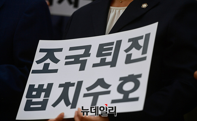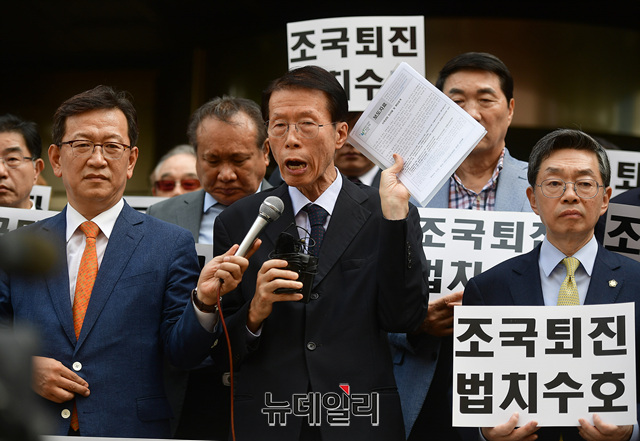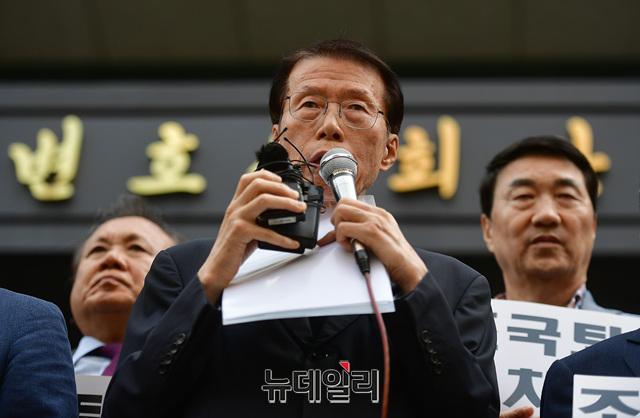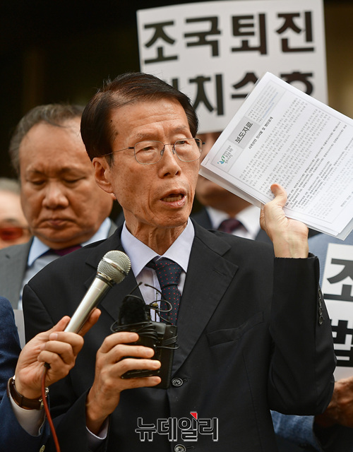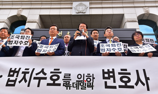 김태훈 한반도인권통일변호사모임 상임대표가 26일 오후 서울 서초구 서울지방변호사협회 앞에서 열린 '조국퇴진과 법치수호를 위한 변호사 시국선언에서 모두발언을 하고 있다. 이번 시국선언에는 전국의 변호사 1,036명(26일 오전 10시 현재)이 참여했다.