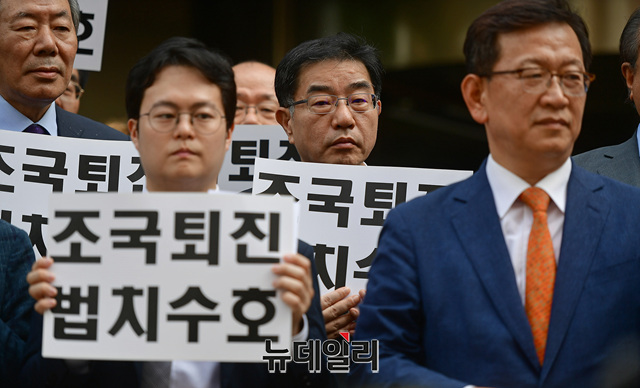 이헌 한반도인권통일변호사모임 공동대표가 26일 오후 서울 서초구 서울지방변호사협회 앞에서 열린 '조국퇴진과 법치수호를 위한 변호사 시국선언에 참석해 자리하고 있다. 이번 시국선언에는 전국의 변호사 1,036명(26일 오전 10시 현재)이 참여했다.