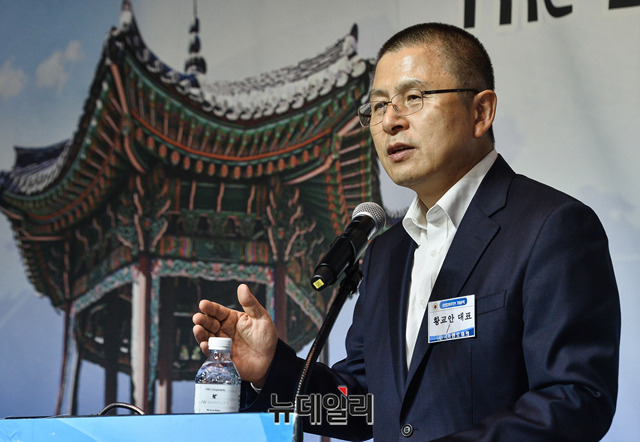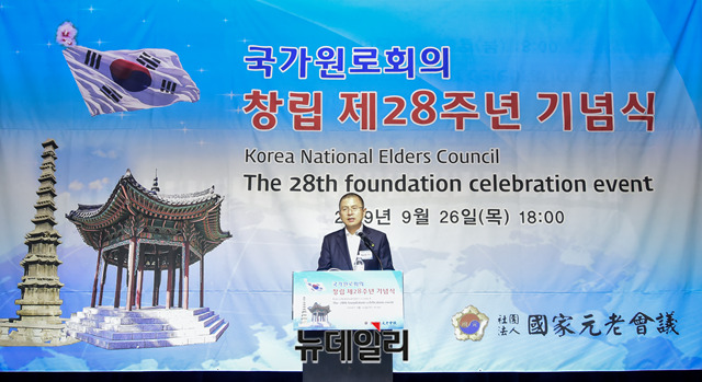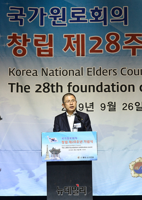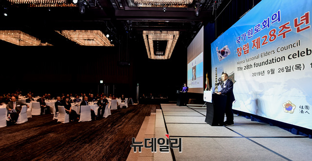 황교안 자유한국당 대표가 26일 오후 서울 서초구 JW매리어트호텔에서 열린 '국가원로회의 창립 제28주년 기념식'에서 축사를 하고 있다.