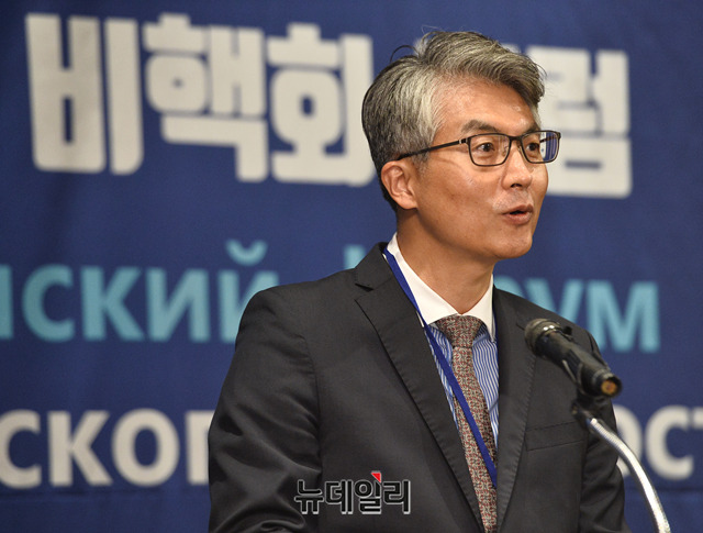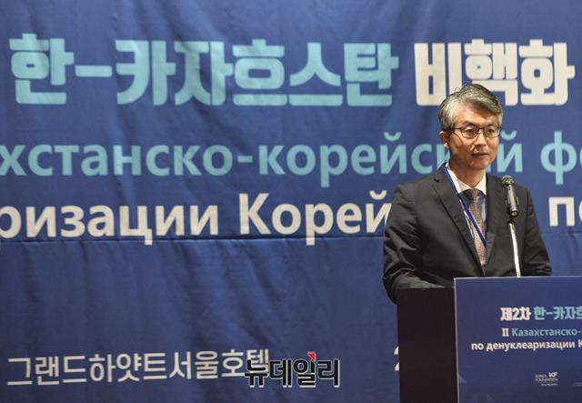 김필우 외교부 유럽국장이 26일 오후 서울 용산구 그랜드하얏트 서울호텔에서 열린 '제2차 한-카자흐스탄 비핵화 포럼'에서 환영사를 하고 있다.