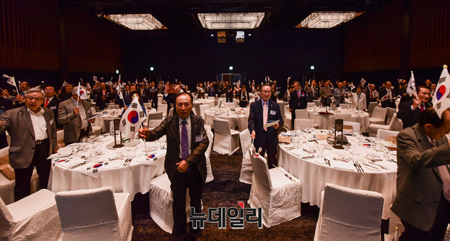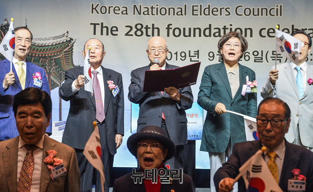 이상훈 국가원로회의 상임의장, 이혜훈 바른미래당 의원 및 참석자들이 26일 오후 서울 서초구 JW매리어트호텔에서 열린 '국가원로회의 창립 제28주년 기념식'에서 결의문을 낭독하며 태극기를 흔들고 있다.