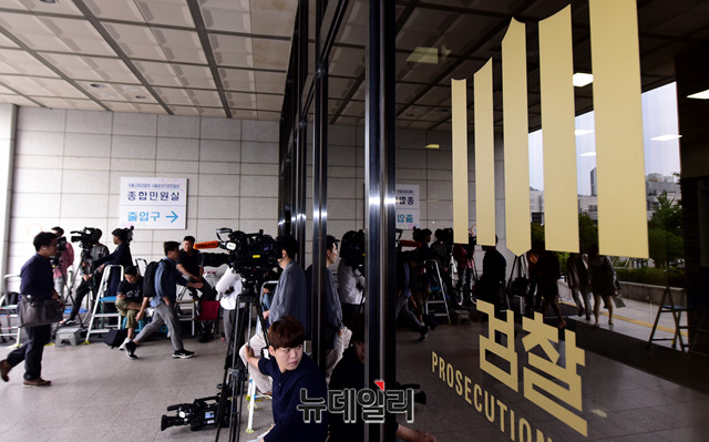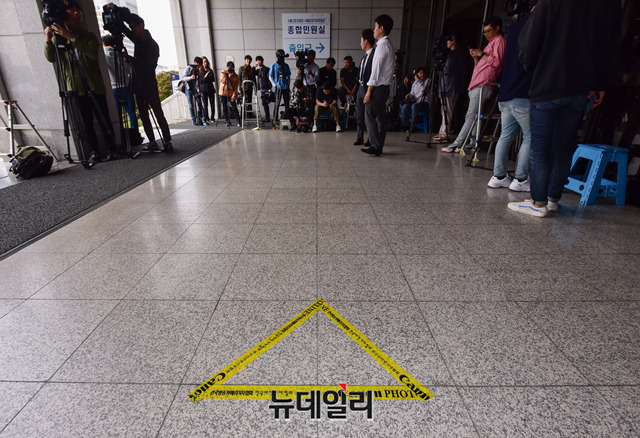 사문서 위조 혐의로 기소된 조국 법무부 장관의 부인 정경심 동양대 교수의 검찰 소환이 임박한 27일 오전 서울 서초구 서울중앙지방검찰청에 취재진들이 정 교수를 기다리고 있다.