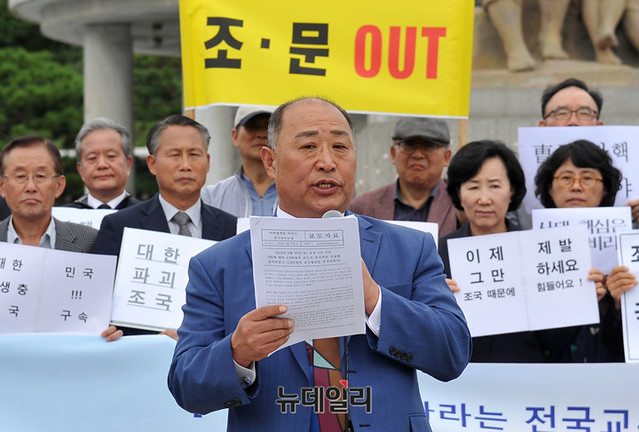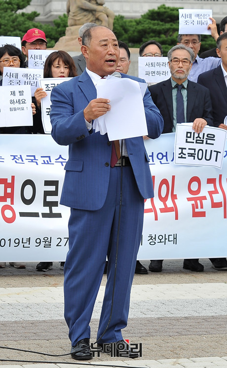 이날 정병권 경희대 교수는 "수많은 비리를 가지고 국민들을 좌절케한 조국 대신에 새로운 사람을 법무장관으로 임명할 것을 강력히 요청한다"며 "만약 조국이 교체되지 않으면 국민은 현정부에 대한 마음이 분노로 바뀌어갈 것"이라고 말했다.