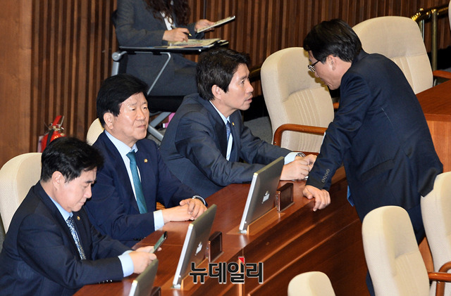 [포토] 국회 대정부질문, 대화하는 '이인영-이원욱'
