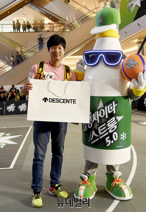'서울 3X3 챌린저 2019' 이벤트 당첨자가 28일 서울 송파구 롯데월드몰에서 열린 대회에 도중 데상트로부터 상품을 받고 기념촬영을 하고 있다.
