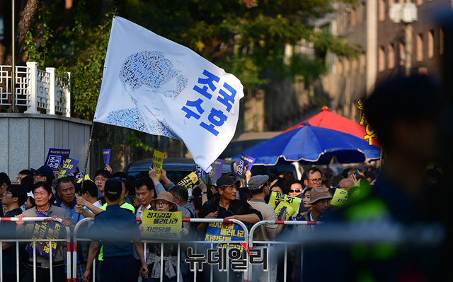 조국 수호를 촉구하는 시민이 28일 오후 서울 서초구 서초대로에서 진행중인 집회에서 조국수호기를 들고 행진하고 있다. 경찰은 대검찰청 앞에서 열린 조국 사퇴 집회 참가자들과 충돌을 막기 위해 펜스를 설치했다. 이날 서초구의 서리풀축제로 반포대교부터 서초대로는 오후 10시까지 차량통행이 차단된다.