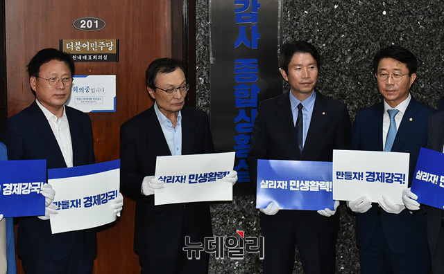 이해찬 더불어민주당 대표, 이인영 원내대표 및 소속의원들이 30일 오전 국회 원내대표실 앞에서 국정감사 종합상황실 현판식을 갖고 있다.