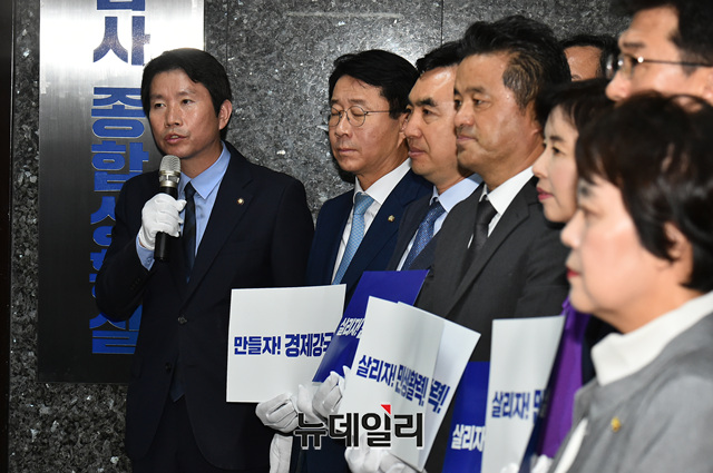 이인영 더불어민주당 원내대표가 30일 오전 국회 원내대표실 앞에서 열린 국정감사 종합상황실 현판식에서 모두발언을 하고 있다.
