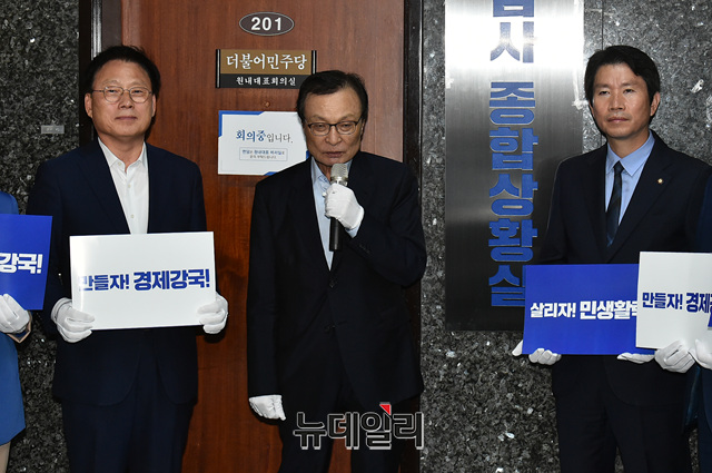 이해찬 더불어민주당 대표가 30일 오전 국회 원내대표실 앞에서 열린 국정감사 종합상황실 현판식에서 모두발언을 하고 있다.