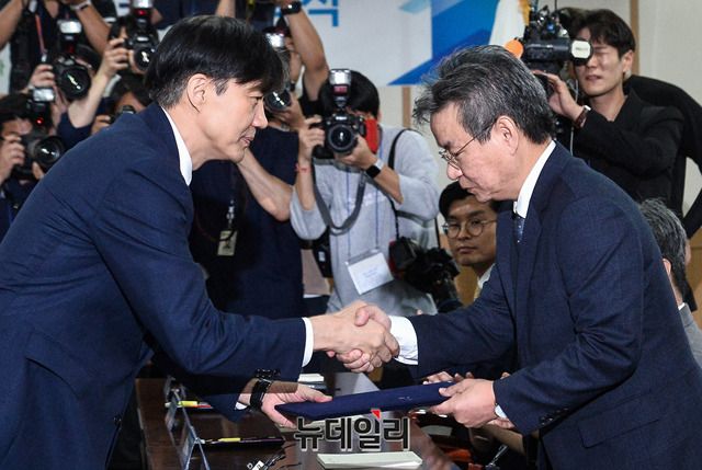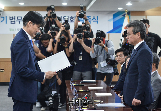 조국 법무부 장관이 30일 오후 경기 과천시 정부과천청사 법무부에서 열린 제2기 법무·검찰 개혁위원회 발족식에서 김남준 법무·검찰 개혁위원장에게 위촉장을 전달하고 있다. (경기 과천=박성원 기자)