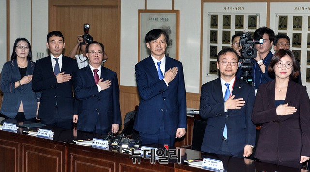 조국 법무부 장관 및 법무·검찰 개혁 위원들이 30일 오후 경기 과천시 정부과천청사 법무부에서 열린 제2기 법무·검찰 개혁위원회 발족식에서 국민의례를 하고 있다. (경기 과천=박성원 기자)