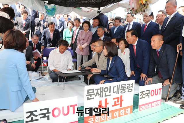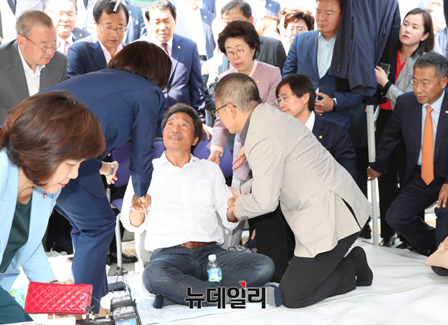 황교한 자유한국당 대표가 30일 오후 16일째 조국 법무부 장관의 사퇴를 촉구하며 국회 본청 앞에서 단식투쟁 중인 이학재 의원의 몸 상태를 살펴보고 있다.