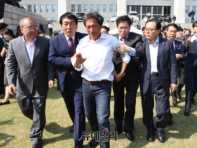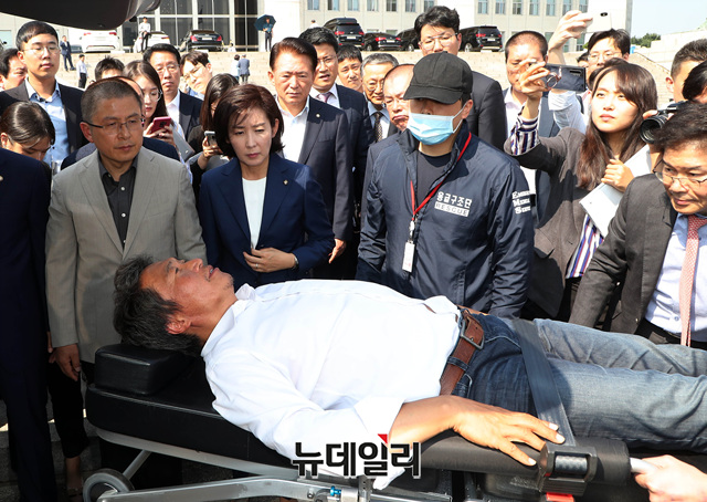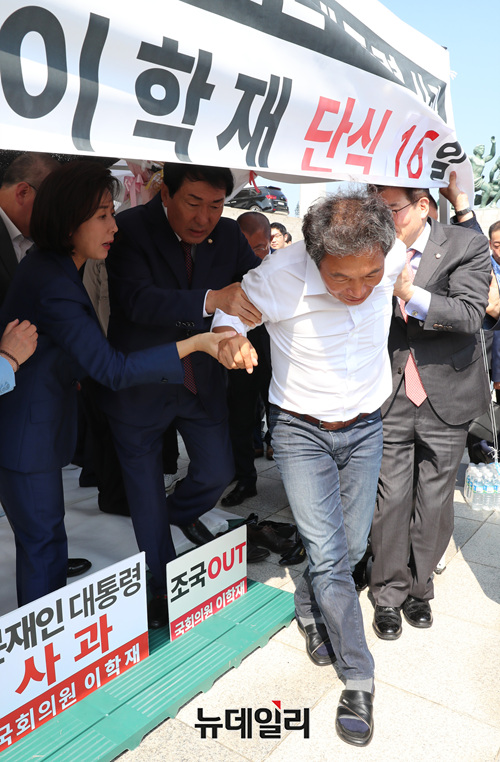 16일째 조국 법무부 장관의 사퇴를 촉구하며 단식투쟁 중인 이학재 자유한국당 의원이 30일 오후 당 지도부의 설득으로 병원으로 이송되고 있다.