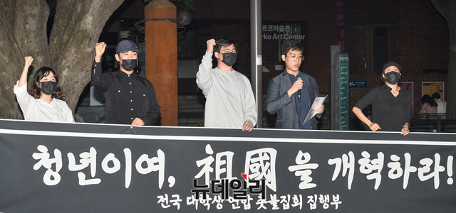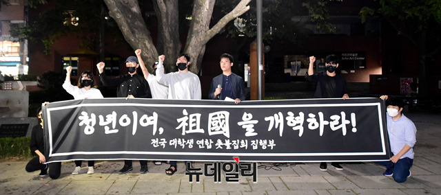 서울·연세·고려대 등 전국 10여 개 대학생들로 구성된 '전국대학생연합 촛불집회' 집행부가 30일 오후 서울 종로구 마로니에공원에서 열린 시국선언 기자회견에서 구호를 외치고 있다.
