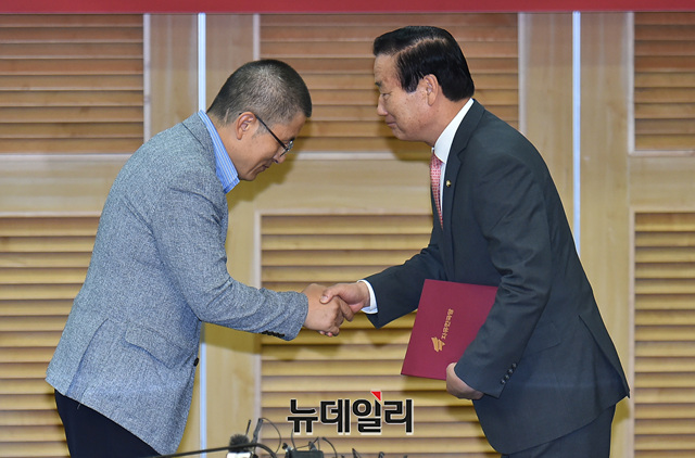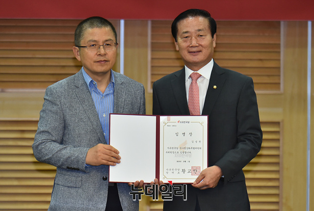 황교안 자유한국당 대표가 1일 오전 국회 의원회관에서 열린 '국가정상화특별위원회 임명장 수여식'에 참석해 김성찬 부위원장에게 임명장을 수여하고 있다.