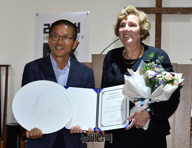 김문수 전 경기지사가 1일 오후 서울 중구 정동제일교회 아펜젤러홀에서 열린 '리멤버(remember) NK' 행사에서 '수잔 솔티(Suzanne Scholte)' 자유북한연합대표에게 '리멤버NK 인권상'을 수상하고 기념촬영을 하고 있다.
