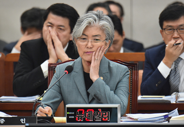 강경화 외교부 장관이 2일 오전 국회에서 열린 외교통일위원회 외교부 국정감사에 출석해 의원들의 질문을 경청하고 있다.
