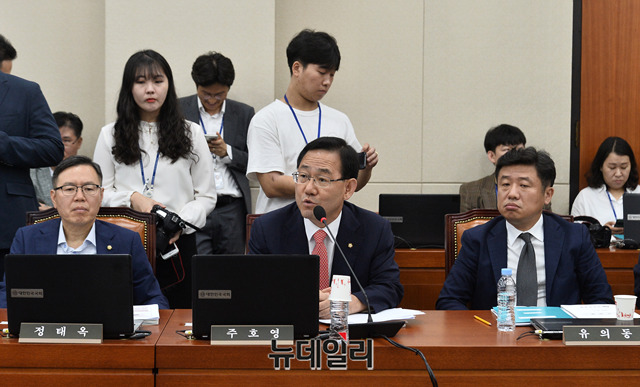 주호영 자유한국당 의원이 2일 오전 국회에서 열린 정무위원회 국정감사에서 질의를 하고 있다.