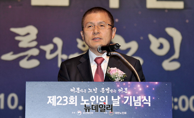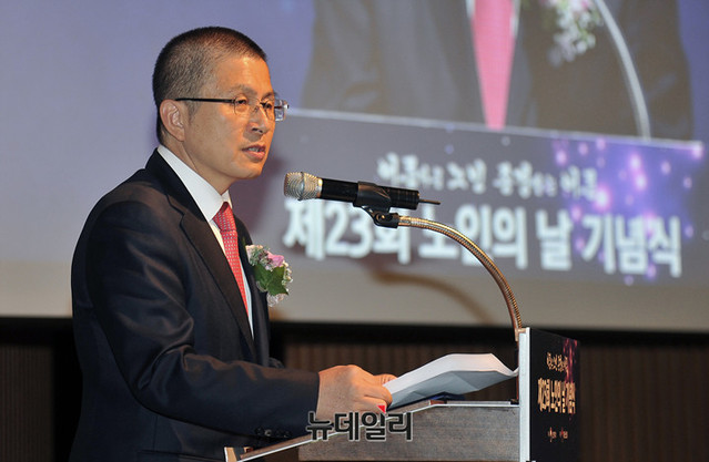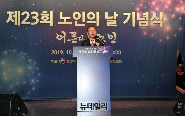 황교안 자유한국당 대표가 2일 오전 서울 중구 대한상의회관에서 열린 '제23회 노인의 날 기념식'에서 축사를 하고 있다.