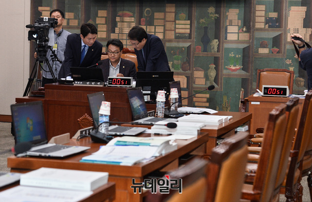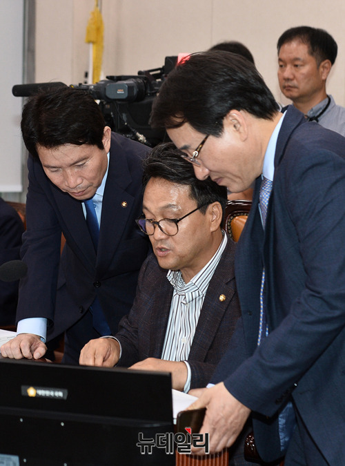 이인영 더불어민주당 원내대표, 안민석 위원장, 이원욱 원내수석부대표가 2일 오후 국회에서 열린 국회 문화체육관광위원회의 문체부에 대한 국정감사에 출석해 대화를 나누고 있다. 이날 자유한국당 의원들이 증인채택문제로 퇴장해 자리가 비어있다.