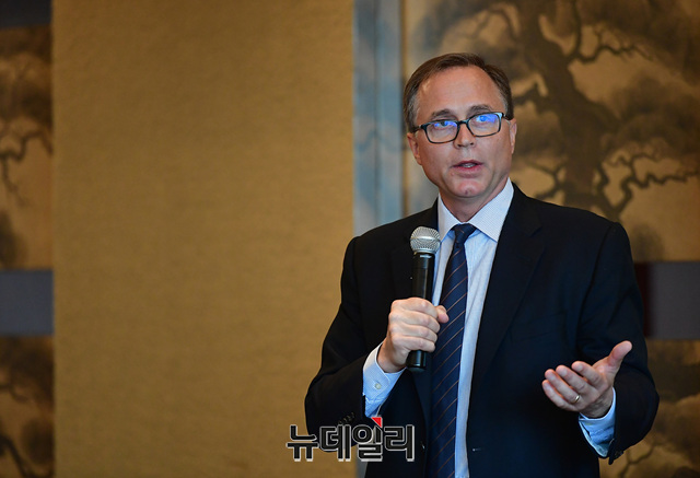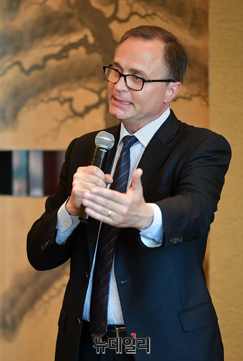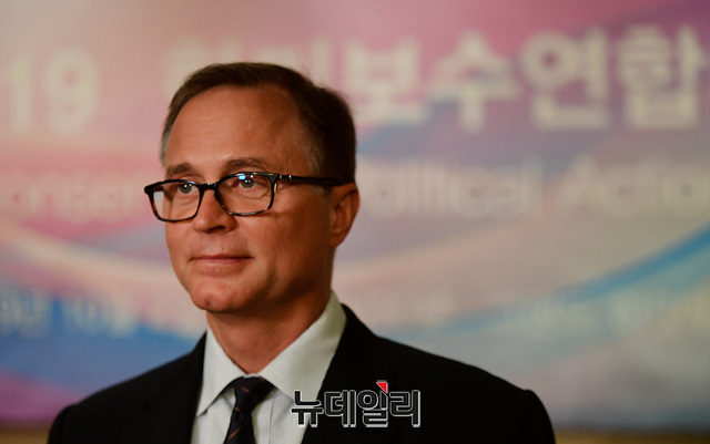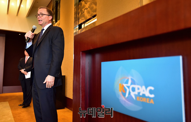 댄 슈나이더 ACU 사무국장이 2일 오후 서울 용산구 그랜드하얏트 호텔에서 KCPAC2019(한·미보수연합대회) 앞두고 열린 오찬행사에서 인사말을 하고 있다.
