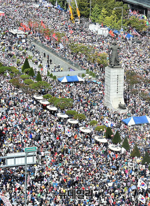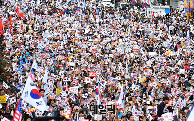 문재인 정권을 규탄하고 조국 장관 사퇴를 촉구하며 모인 시민들이 3일 오후 광화문 광장부터 서울광장까지 가득 운집해 있다.