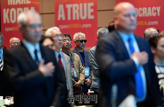 류석춘 연세대 교수가 3일 오후 서울 용산구 그랜드하얏트 호텔에서 열린 '한미보수연합대회(KCPAC2019)'에 참석해 국민의례를 하고 있다.'한미보수연합대회'가 진행된 같은시간 광화문 광장과 서울역 일대에서는 '문재인 하야와 조국 사퇴'를 촉구하는 우파시민들이 광장에 운집했다.이번 행사는 자유민주주의 가치 확산을 위한 범보수진영의 확고한 연대와 미국 ACU 등 세계 보수진영과의 적극적 연대와 미래세대에게 자유민주주의 교육의 확대, 강화 시키기 위해 열렸다.