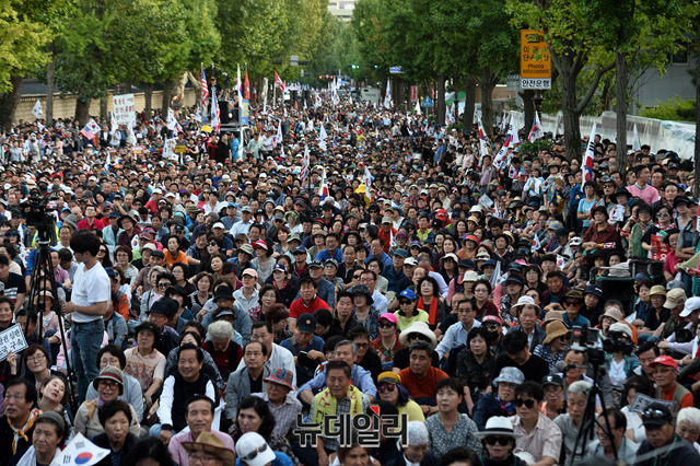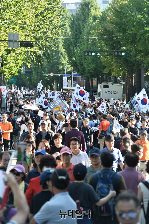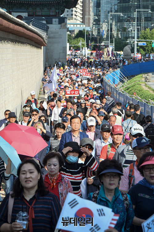 문재인하야범국민투쟁본부 등 우파단체가 3일 오후 서울 광화문 광장에서 집회를 마치고 청와대 방향으로 가두행진을 하고 있다.