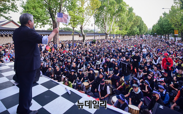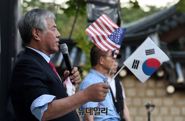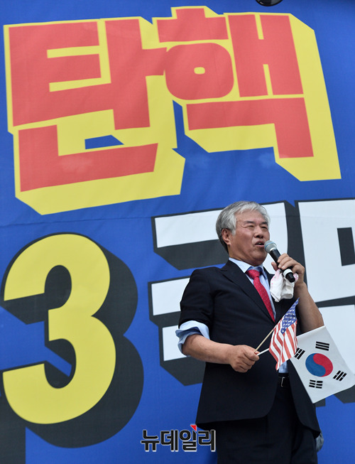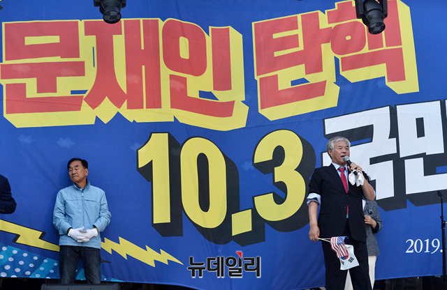 전광훈 한국기독교총연합회 대표가 3일 오후 청와대 분수대광장 앞 거리에서 열린 '문재인 탄핵 10.3 국민대회'에서 태극기와 성조기를 들고 '문재인 대통령 탄핵' 관련 발언을 하고 있다. 이날 문 정권 규탄과 조국 파면을 요구하며 모인 시민들은 광화문 광장과 서울역 인근에서 동시다발적으로 집회를 개최했다.