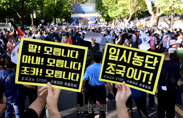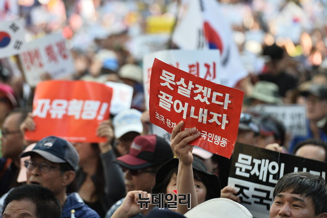 문재인하야범국민투쟁본부 등 우파단체가 3일 오후 청와대 분수대광장 앞 거리에서 열린 '문재인 탄핵 10.3 국민대회'에서 피켓을 들고 '문재인 탄핵' 관련 구호를 외치고 있다.
