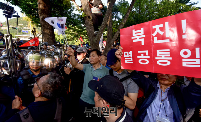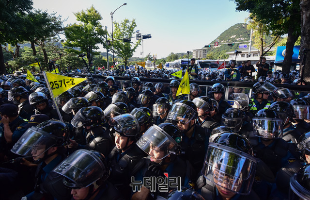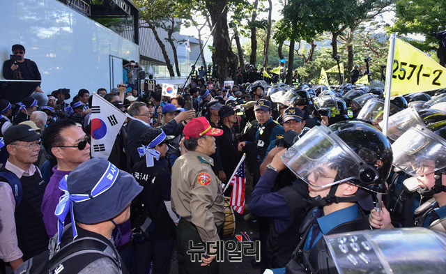 문재인하야범국민투쟁본부 등 우파단체가 3일 오후 청와대 분수대광장 앞 거리에서 '문재인 탄핵 10.3 국민대회'를 진행하는 가운데 경찰이 청와대 앞을 가로막고 있다.