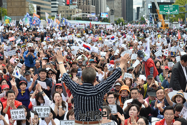 황교안 자유한국당 대표가 3일 오후 서울 광화문 광장에서 열린 '문재인정권 헌정유린중단과 위선자 조국파면 촉구대회'에 입장해 지지자들에게 인사하고 있다.