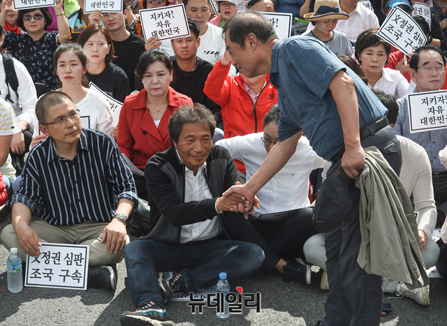 김병준 전 자유한국당 비상대책위원장이 3일 오후 서울 광화문 광장에서 열린 '문재인정권 헌정유린중단과 위선자 조국파면 촉구대회'에 참석해 이학재 의원과 악수를 하고 있다. 이 의원을 조국 장관의 사퇴를 촉구하며 단식을 19일째 이어가고 있다.