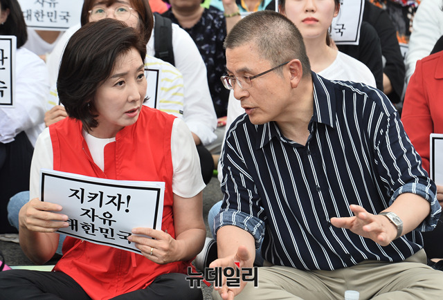 황교안 자유한국당 대표와 나경원 원내대표가 3일 오후 서울 광화문 광장에서 열린 '문재인정권 헌정유린중단과 위선자 조국파면 촉구대회'에서 대화를 나누고 있다.
