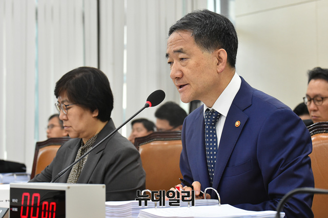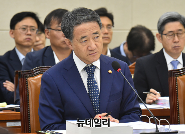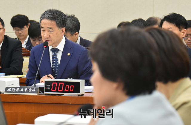 박능후 보건복지부장관이 4일 오전 국회에서 열린 보건복지위원회 국정감사에 출석해 의원들의 질문에 답하고 있다.