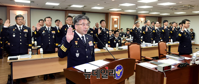 민갑룡 경찰청장 및 경찰들이 4일 오전 서울 서대문구 경찰청에서 열린 국회 행정안전위원회의 경찰청 국정감사에 참석해 선서를 하고 있다.