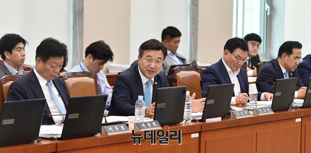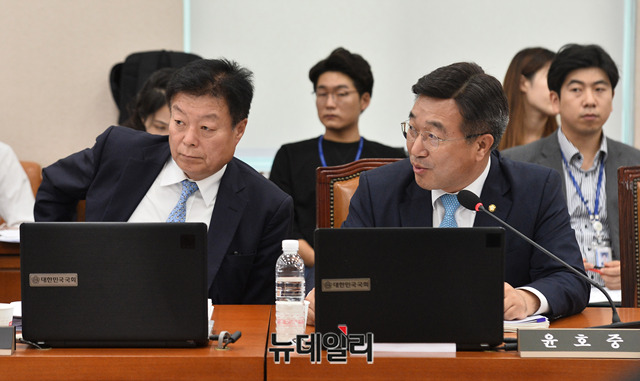 윤호중 더불어민주당 의원이 4일 오후 국회에서 열린 국토교통위원회의 국토교통부 국정감사에서 질의를 하고 있다.