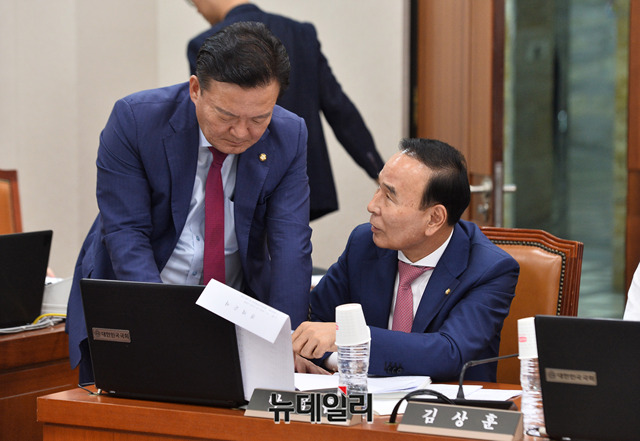 [포토] 국토교통부 국감, 대화나누는 '박덕흠-민경욱'